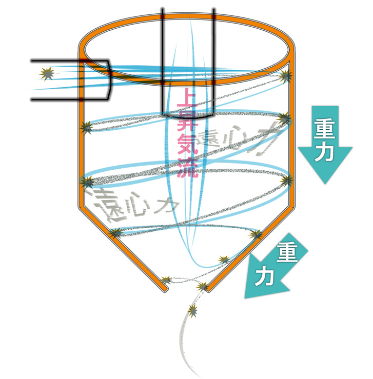 分離機の中心部分では上昇気流が発生しており、空気だけが上の吸込口に向かって突き抜けていきます。分離機で強力な遠心力を発生させるほど、切削屑は外周の壁をぶつかりながら回収タンクに落ちていくので、質量のある切削屑は空気と一緒に上の吸込口から逃げだせにくくなっています。