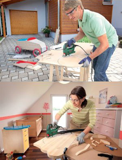 ジグソーは、幅の細いブレード(鋸刃)を糸鋸(イトノコ)のように上下運動させて木材や金属などを切断することができます。