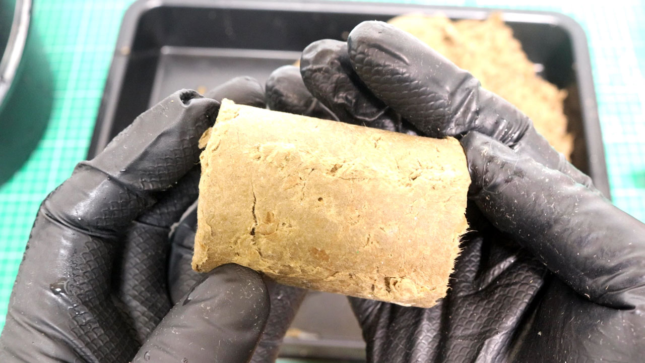 圧縮させたダンボール薪を実際に手に取ってみると、落としたり転がしたりしても形が崩れず、十分な強度があることがわかりました。この成形精度と強度を活かせば、素材を変えることで種まき用の培養土ポットや、キノコ栽培用の菌床など、燃料以外の用途にも応用できる可能性がありそうです。
