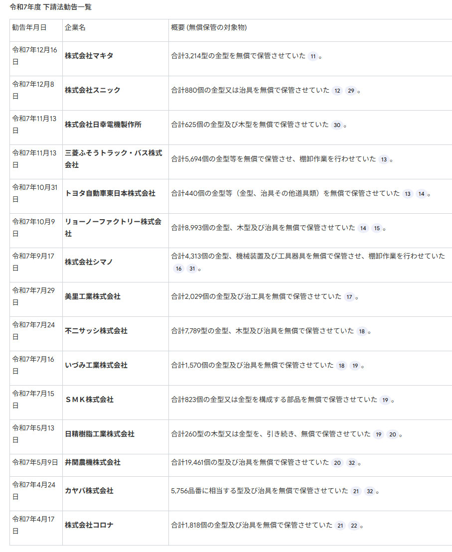 下請け業者に金型等を無償で保管させて公正取引委員会から下請法第4条第2項第3号(不当な経済上の利益の提供要請の禁止)に基づく勧告を受けた企業一覧(2025年)